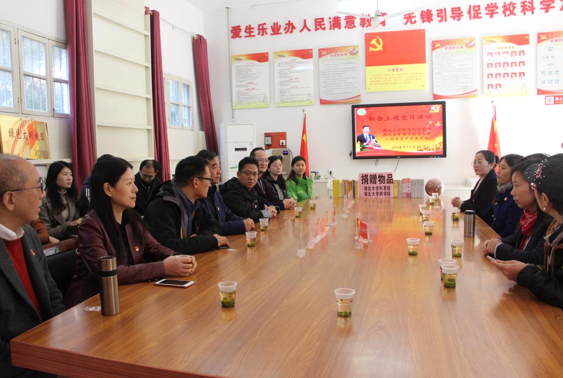 当日上午全体成员前往英山县二程希望中学参与图书捐赠活动,为孩子们送去有利于成长的精神食粮。捐赠结束之后,全体人员分三组进行活动。第一组成员走进中学课堂,听教师授课,考察学生的上课情况。第二组与该校篮球队进行友谊篮球赛,比赛双方本着友谊第一比赛第二精神友好切磋,在比赛中互相促进,场面十分热闹。第三组前往大屋冲村走访慰问,看望工作队成员,再分七组前往七户人家慰问,了解村民生活状况。