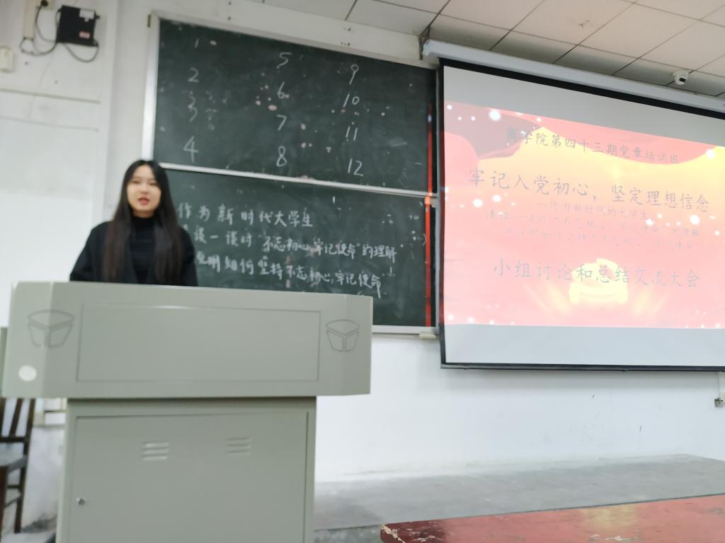 课上,同学们分组进行交流。各组纷纷展开热烈讨论,表达了自己对“不忘初心,牢记使命”的理解,讨论了作为当代大学生我们应如何不忘初心、身体力行,把人生理想融入国家与民族的事业中。大会最后,组织部王诗睿同学提出,作为当代青年学生,我们也应将中国共产党的初心与使命牢记在心,即为中国人民谋幸福,为中华民族谋复兴。组织部严嘉靖同学说到:“我们应将自己的理想同中国共产党的初心与使命相结合,做一个有理想、有信念、有担当的中国青年。为社会主义贡献出自己的力量。”