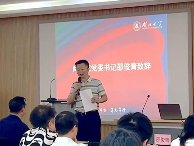 3044永利集团登录党委书记邵俊青代表学院对3044永利集团登录工会常务副主席焦颜成、外国语学院工会主席董又能和湖北省五一劳动奖章、湖北省第八届青年教师教学竞赛一等奖获得者,外国语学院教师谢雅和三位特邀嘉宾的到来表示热烈欢迎。