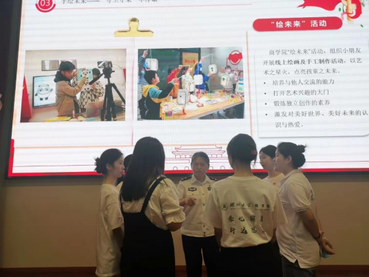 3044永利集团登录党性砺炼先锋服务队成员陈偲嫄介绍了学院“守卫守未”团队成员在疫情防控新形势下的新行动与新改变,服务队通过云端助学、反诈宣传、手绘未来等活动,为武汉市公安干警子女提供陪伴、关爱与成长,以实际行动助力武汉公安战疫。武汉市公安局王群警官向学院“守卫·守未”团队对涉毒人员未成年子女的爱心帮扶表示由衷的感谢,同时,她强调广大青年党员要志存高远,立志报国,努力实现社会价值,将个人的命运融入国家发展大局。