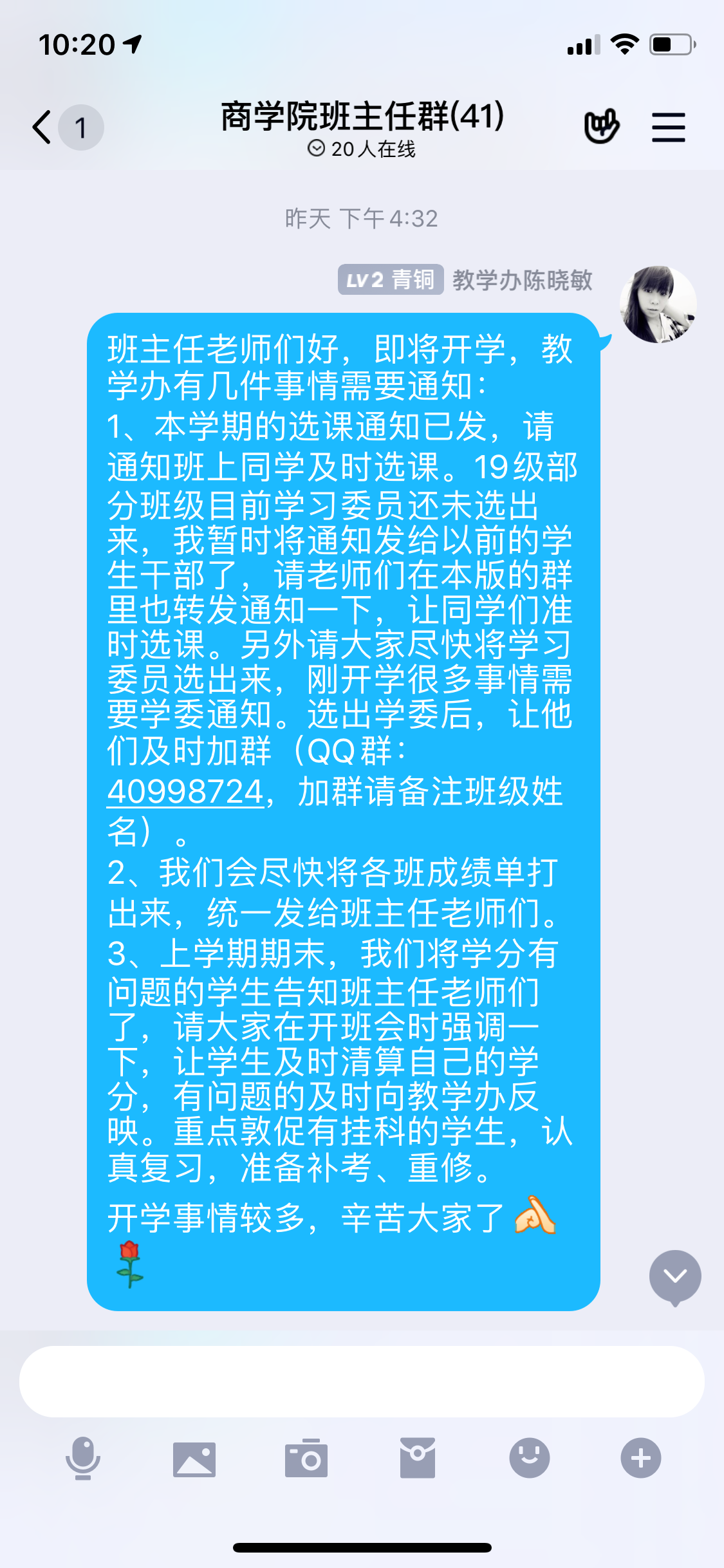 3044永利集团登录教学办为保障开学教学工作的顺利开展,主动谋划,积极对接班主任老师,任课教师,学生干部。通知提醒授课教师认真备课,做好开学上课准备;联系班主任教师选拔学生干部,关注学业困难生的补考、重修工作;对接班干部及时通知选课、上课安排。除此之外,开学的教材领取、成绩单打印、学业预警等相关工作都在积极落实中。