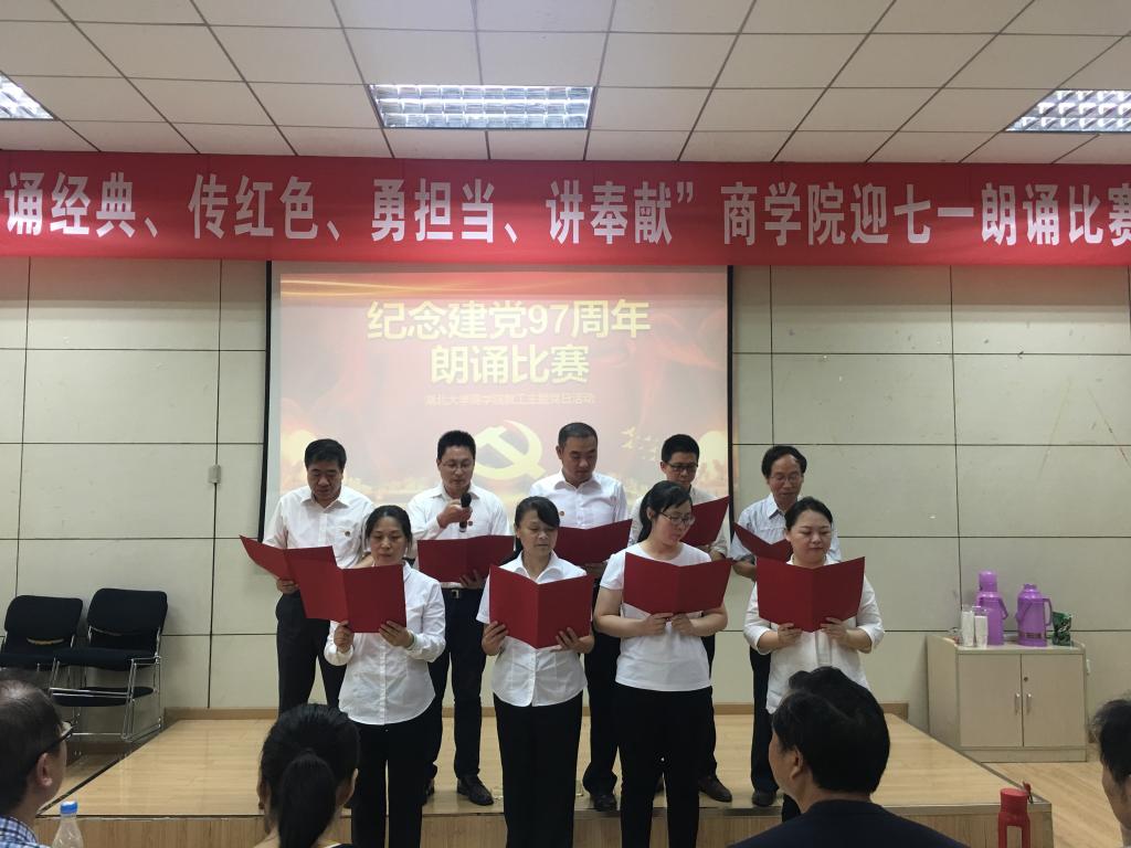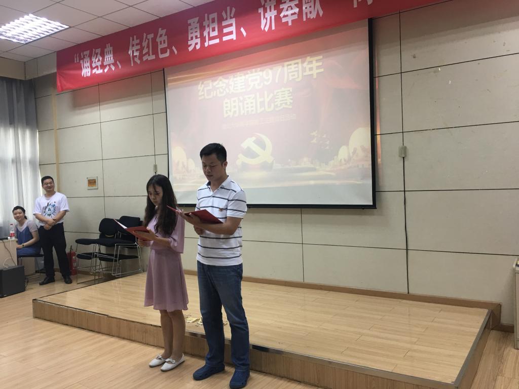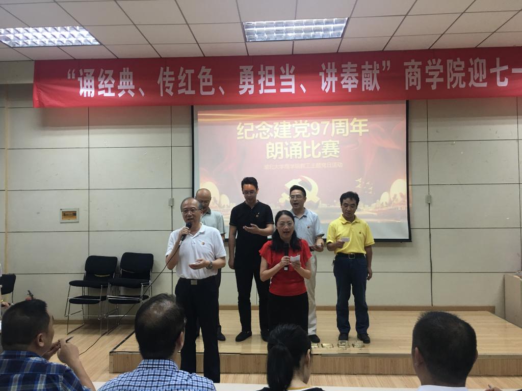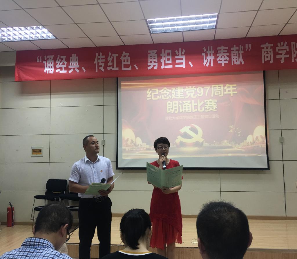 会计学党支部的朗诵《照亮了黑暗的岁月》让我们重温了中国共产党带领着中国人民实现了从站起来、富起来到强起来97个峥嵘的岁月;行政党支部的朗诵篇目《我有祖国、我有母语》则让我们领略了汉语的魅力;学工党支部的《党旗下》让我们听到了年轻一代新人在党旗下庄严的承诺:我们愿接受党和祖国的随时检阅,为教育事业奋斗终身;国经金融联合党支部杜红军和陈汉林老师、旅游游管理党支部全体党员教师、经济学工程管理联合支部先后献上了朗诵《光的赞歌》、《七律·人民解放军占领南京》、《有一首歌》,引起现场观众的阵阵赞叹;比赛在大工商教工联合党支部刘刚教授的朗诵《沁园春·长沙》中到达高潮。刘刚教授通过富有激情的朗诵,带我们感受了长沙的秋景,感受到了革命青年对国家命运的感慨,抒发了改造旧中国的豪情壮志,另在场的每一位党员同志精神振奋。