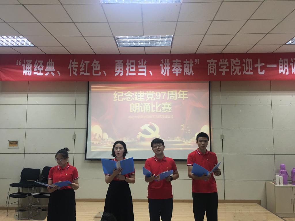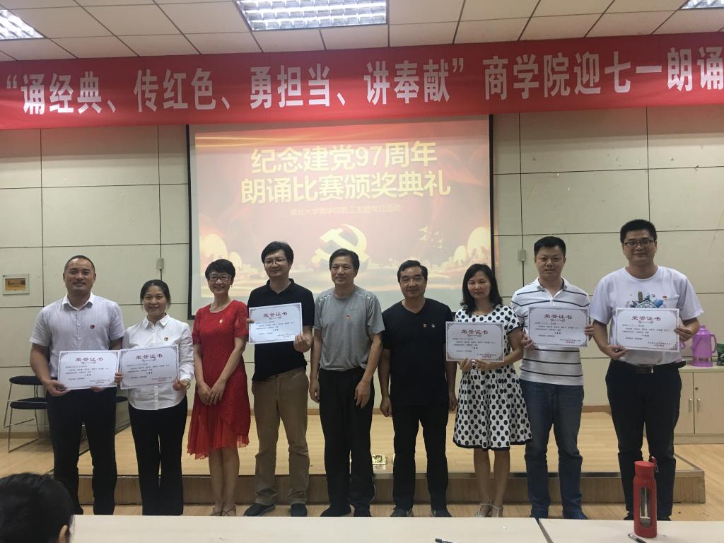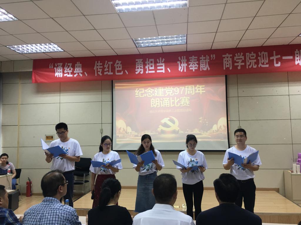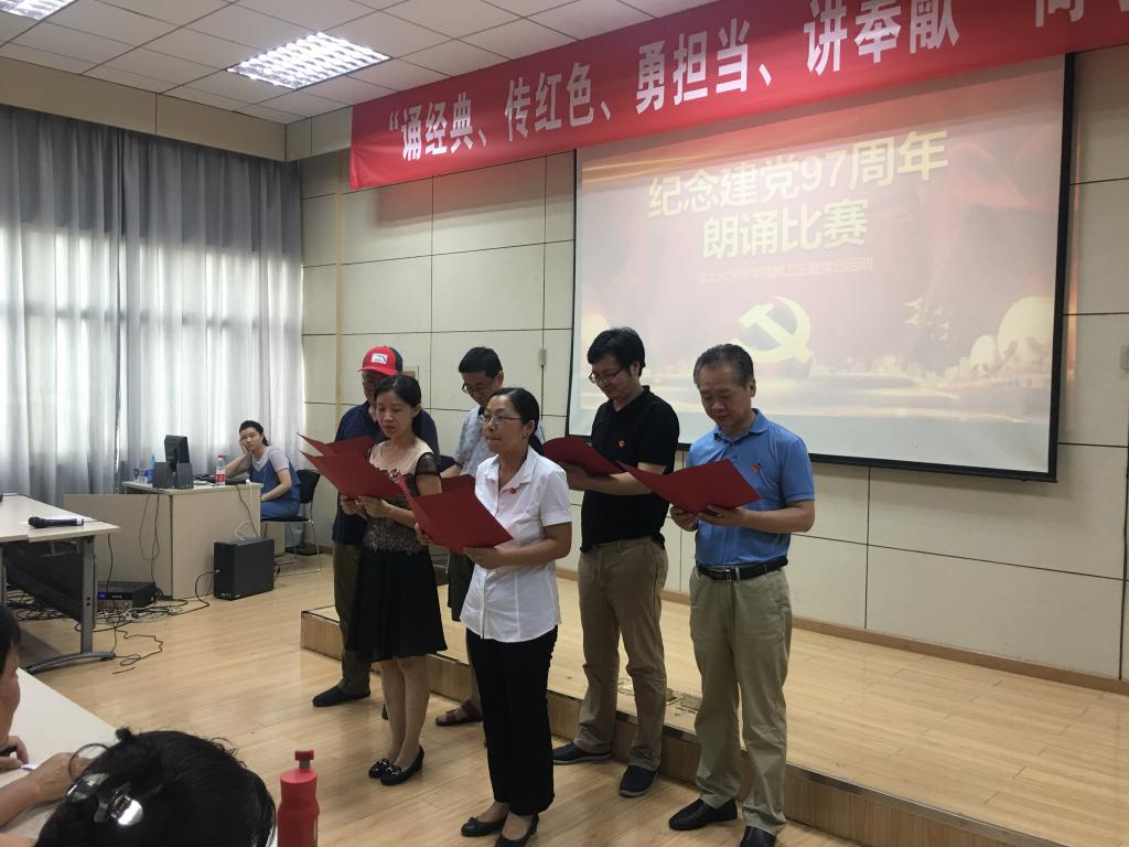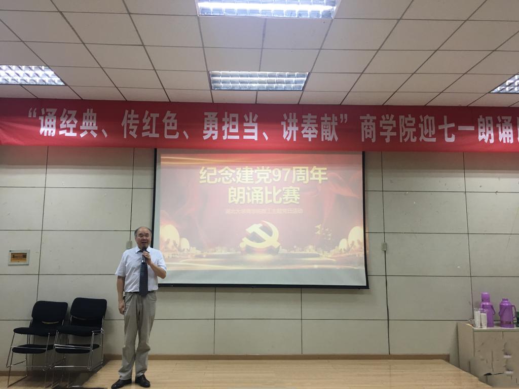 会计学党支部的朗诵《照亮了黑暗的岁月》让我们重温了中国共产党带领着中国人民实现了从站起来、富起来到强起来97个峥嵘的岁月;行政党支部的朗诵篇目《我有祖国、我有母语》则让我们领略了汉语的魅力;学工党支部的《党旗下》让我们听到了年轻一代新人在党旗下庄严的承诺:我们愿接受党和祖国的随时检阅,为教育事业奋斗终身;国经金融联合党支部杜红军和陈汉林老师、旅游游管理党支部全体党员教师、经济学工程管理联合支部先后献上了朗诵《光的赞歌》、《七律·人民解放军占领南京》、《有一首歌》,引起现场观众的阵阵赞叹;比赛在大工商教工联合党支部刘刚教授的朗诵《沁园春·长沙》中到达高潮。刘刚教授通过富有激情的朗诵,带我们感受了长沙的秋景,感受到了革命青年对国家命运的感慨,抒发了改造旧中国的豪情壮志,另在场的每一位党员同志精神振奋。