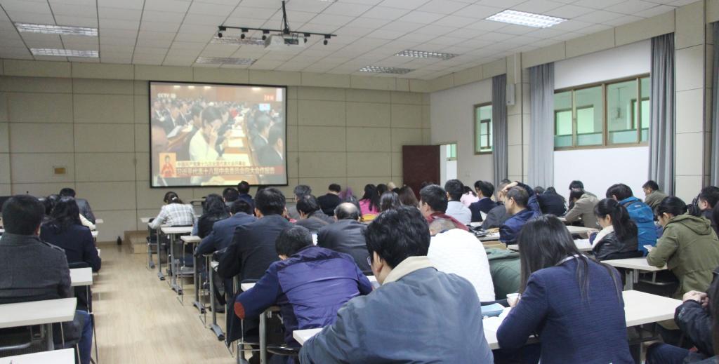 十九大是全面建成小康社会决胜阶段、中国特色社会主义进入新时代的关键时期召开的一次十分重要的大会。大会的主题是:不忘初心,牢记使命,高举中国特色社会主义伟大旗帜,决胜全面建成小康社会,夺取新时代中国特色社会主义伟大胜利,为实现中华民族伟大复兴的中国梦不懈奋斗。我院对此次大会给予了高度重视,院党委在开会前夕发出学习通知,组织了教工党员、全体教职工和研究生党员、15级联合党支部学生党员观看直播,到场人员都认真听取大会内容。