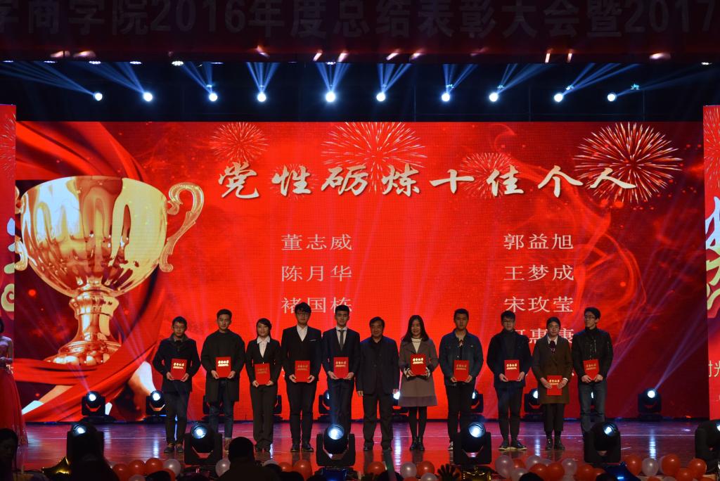 焦颜成首先为全院师生带来了美好的新年祝福,对3044永利集团登录全体师生在2016年所做的工作与努力表示了充分的肯定和由衷的感谢。在接下来的表彰大会上,以经济学1502班班主任徐俊武为代表的一批优秀班主任荣获“十佳班主任”称号,“十佳党性砺炼个人”此外还对“十佳党性砺炼个人”和“商院之星”进行表彰。其中“自强之星”李维的母亲坐了24个小时的火车来到了晚会现场并被邀请上台,李维献唱一曲《时间都去哪了》,用歌声来表达对母亲的感谢与感恩。