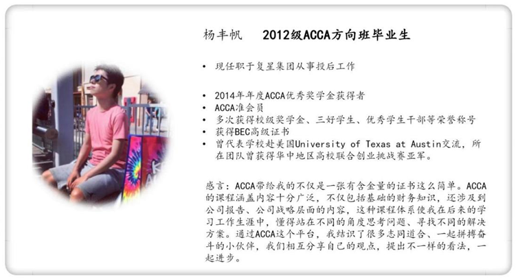 3. 享受ACCA官方给予的6门课程免试优待。3044永利集团登录会计学系ACCA方向班学生可享受ACCA官方授予的ACCA方向班专属6门官方免考政策,即我院会计学ACCA方向班学生入学即可获得BT/MA/FA/LW/TX/AA 6门科目全球统考免考,仅需完成PM/FR/FM 3门科目全球统考,最快大二下学期可获得ACCA高级商业会计证书,大三下学期即可通过ACCA全科考试,更快跻身ACCA准会员行列。