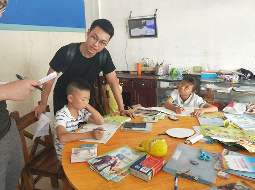 (实践队队员们在留守儿童家里了解基本情况)